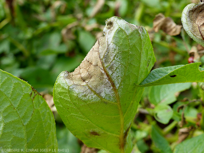 On the lower side of these flecks, especially under humid conditions, a white to grey mould, corresponding to the mycelium and spores of the pathogen, appears (Figures 1-3). (The spores allow the reproduction, but also the dissemination of P. infestans from plant to plant, and hence cause the epidemic propagation between plots or crops).