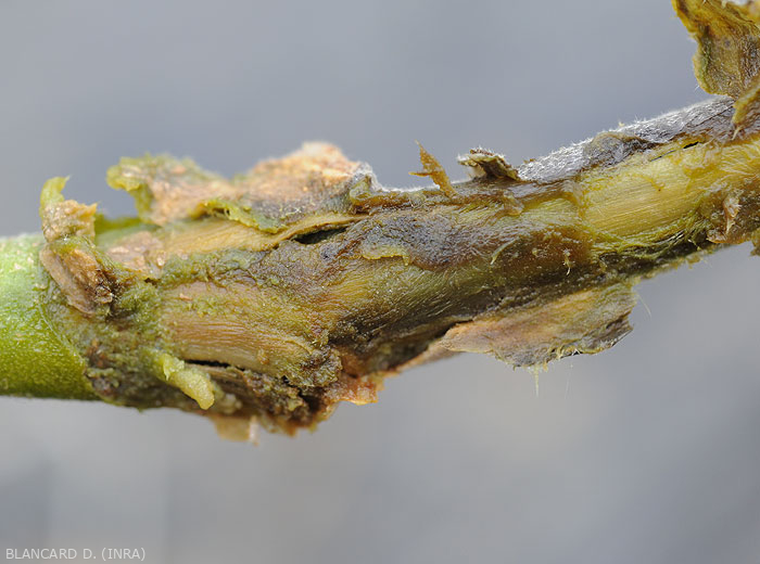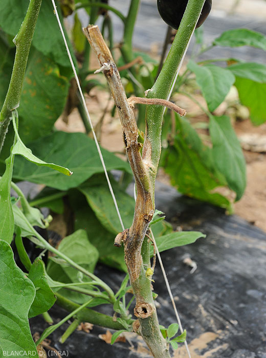 Wet and brown lesions extending inside the stem, in the pith which liquefies rather quickly, and eventually widens (Figures 1 and 2), the vascular tissues turn brown more or less equally.