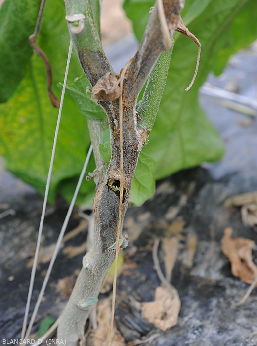 Longitudinal alteration of the stem which takes on a dark brown to black tint and may be girdled for several centimeters (figure 3).