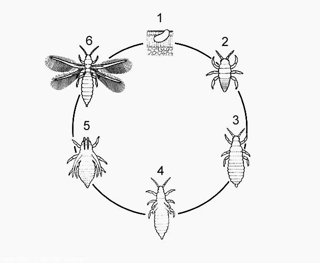The development of thrips comprises 6 stages (figure 6): egg, two larval stages, two pronymph stages and adult (figure 6). The length of the cycle varies depending on the temperature and the host plant; for example, for F . occidentalis it fluctuates from 34 days at 15 ° C to 13 days at 30 ° C.