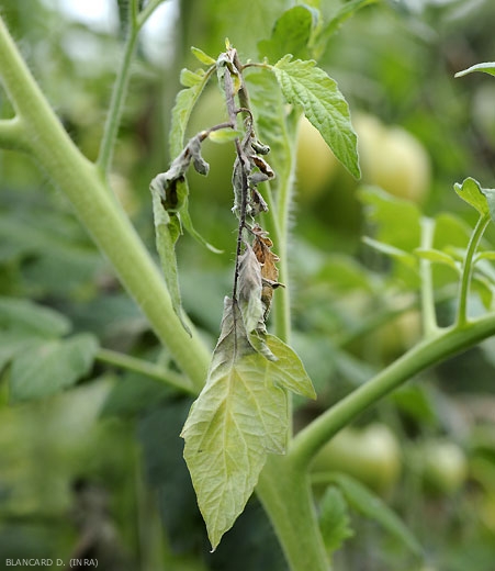 Downy mildew can attack all the aerial organs of the tomato . It is characterized by the development of spots patches initially wet , or even , on the leaflets (Figure 1). These attacks locally give the affected tissues a tint pale green to green-brown . Large portions of the leaf blade are eventually affected and soon turn brown and necrose (Figures 2 and 3). These spots are frequently surrounded by a livid, ill-defined margin of tissue on which sometimes forms, on the underside of the blade, a discreet and fleeting white down consisting of the sporocystophores and sporocysts of P. infestans . When conditions are particularly favorable, the progression of symptoms on the leaflets is rapid. Leaves, twigs and even plants eventually die off and dry out completely (Figure 4).