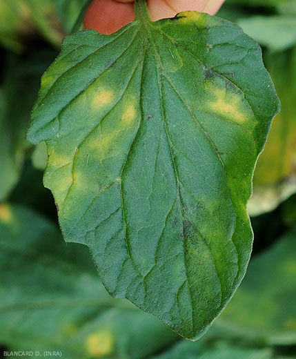 The plants affected by Verticillium dahliae frequently show a discreet wilting of lower leaflets at the hottest times of the day. At first, this wilting is reversible overnight. Subsequently, as the disease develops, it can be observed that certain sectors of the leaf blade, often interveinal and in the shape of a “V”, gradually soften and turn yellow (figures 1 to 5). Large portions of the leaflets eventually turn beige to brown and then necrose. Leaflets and leaves thus affected die prematurely, which can lead to exposure of the fruits to solar radiation and therefore the risk of solar burns .
