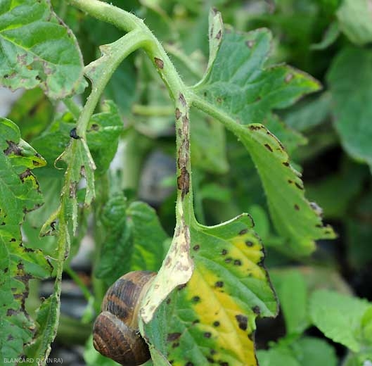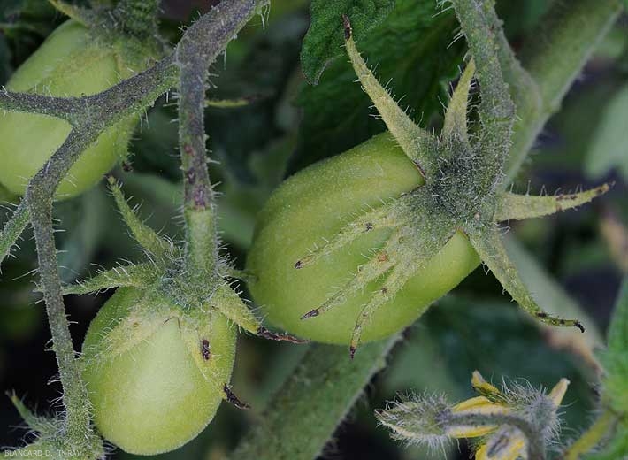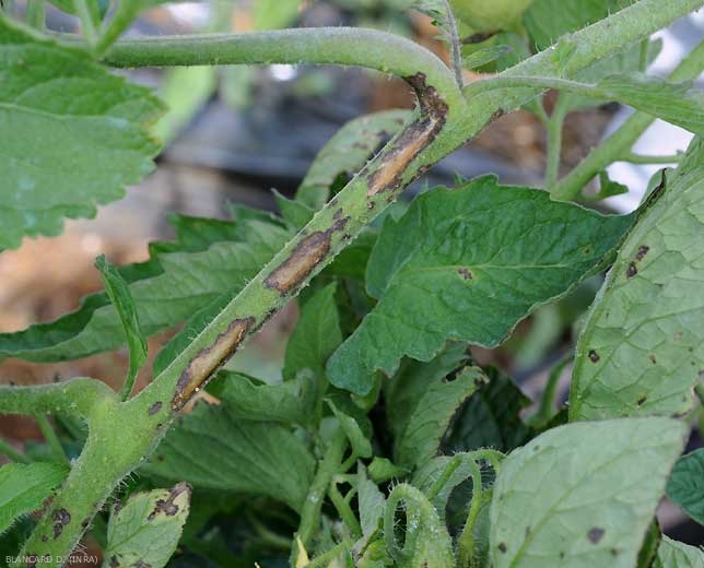 Of similar lesions are seen on other organs, especially on petioles , the stem (Figure 5), the stems and sepals fruit. They are frequently more extensive and elongated than on the leaflets. When present on the flower pedicels, a few flowers may fall.