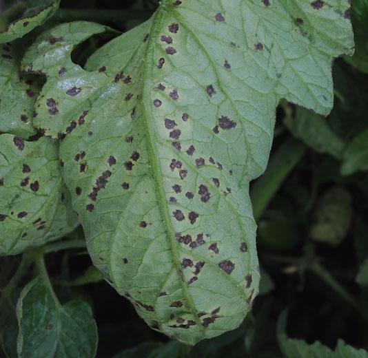 Symptoms on leaves of bacterial scab caused by Xanthomonas spp. are quite comparable to those described for Pseudomonas syringae pv. tomato : small, fatty, translucent lesions appearing at random on the leaflets or at the edge of the leaf blade and subsequently resulting in brown to black spots (Figures 1 to 3). They are circular or slightly angular, with a diameter of 2-3 mm, and sometimes haloed with a yellow halo. Their center dries up, and degraded fabrics can eventually fall off. In the presence of moisture, these spots can spread and merge, altering large areas of the blade that eventually necrosis and dry out (Figure 4). In some cases, whole leaves turn yellow, dry out; they can either remain attached to the plant or fall. Young leaves are often more sensitive.