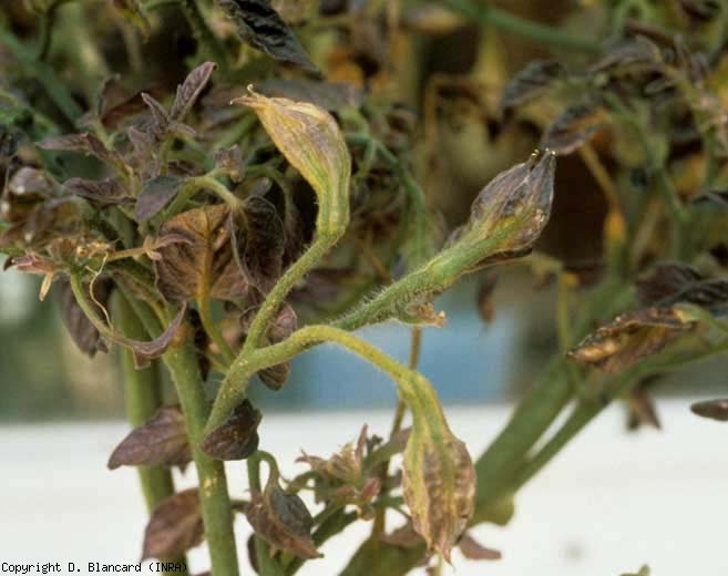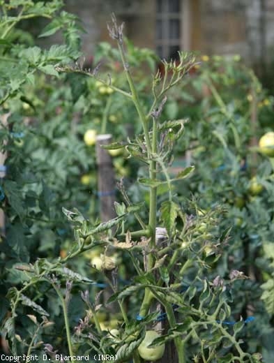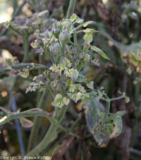 The phytoplasmas attacking the tomato cause various symptoms on the aerial organs, young and growing, of this nightshade. In France, they often appear during the month of July, or even early August. From this period, the growth of affected plants is often slowed down . The apices form shorter internodes and smaller leaves, sometimes rolled up. The lamina tissues are often thicker and even brittle (Figures 1 to 3).