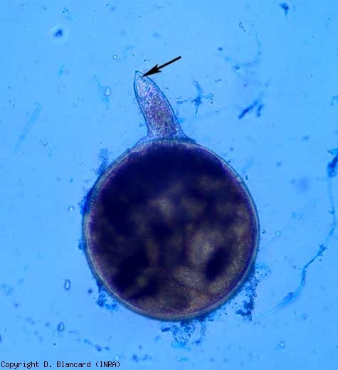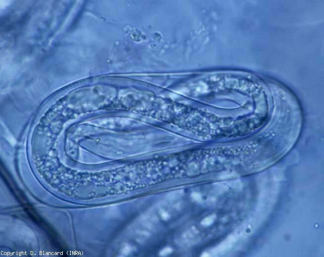 Second instar larvae, attracted by root exudates and other compounds, enter the roots and migrate to the vascular system through the cortex, between cells (Figure 2). During their bites, they secrete enzymes that cause migration in the root and the development of giant cells that will contribute to their nutrition. Larval development continues at the same time as the root swells. Ultimately, a gall surrounds a large female piriformis (Figures 3 and 4). This produces many eggs (300 to 3000, between 400 and 500 on average) which are emitted outside the root, embedded in a mucilaginous matrix. Several generations take place during a season, and the infestation can then reach 100,000 to 200,000 larvae / kg of soil