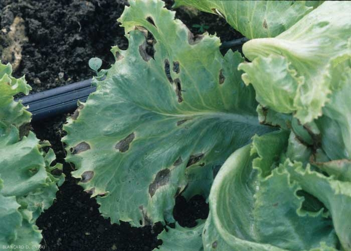 De nombreuses causes peuvent être incriminées lorsqu'on observe des taches brunes ou noires sur feuilles de salade. Les figures 1 à 5 permettent de mieux appréhender l'observation d'un système foliaire altéré.