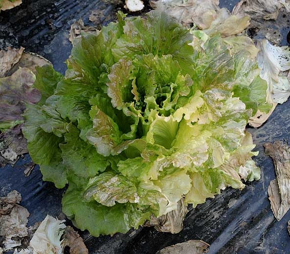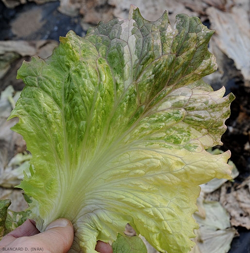 Un certain nombre d'anomalies génétiques se manifestent sur salade. Bien souvent, le nombre de plantes affectées est très faible et, dans de nombreuses situations, la plante en question constitue une véritable curiosité (figure 1). Généralement, la coloration et la forme des feuilles sont relativement caractéristiques et ne prêtent pas à confusion.Les chimères foliaires se traduisent par un jaunissement, voire un blanchiment sectoriel du limbe plus ou moins marqué. Ainsi, les feuilles présentent de larges et irrégulières zones jaune-vert à blanc crème, conférant aux feuilles un bel aspect de marbrure et de mosaïque (Panachure, figures 2 à 4). Les plantes très affectées peuvent être totalement blanches (Albinisme, figure 5) et mourir. Ces décolorations sont dues à une anomalie de développement des chloroplastes dans les tissus foliaires.