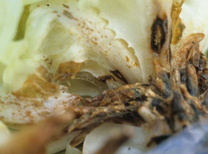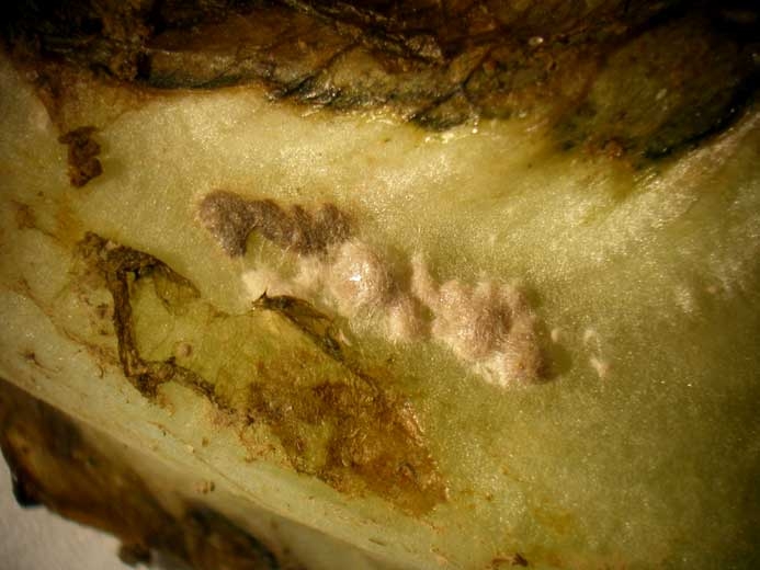 On or near the damaged tissues, there are sometimes discreet whitish to brown filaments (Figures 3 and 7) running along the stem, veins and leaf to leaf. Poorly defined, brown masses are sometimes located along the veins (Figure 8).