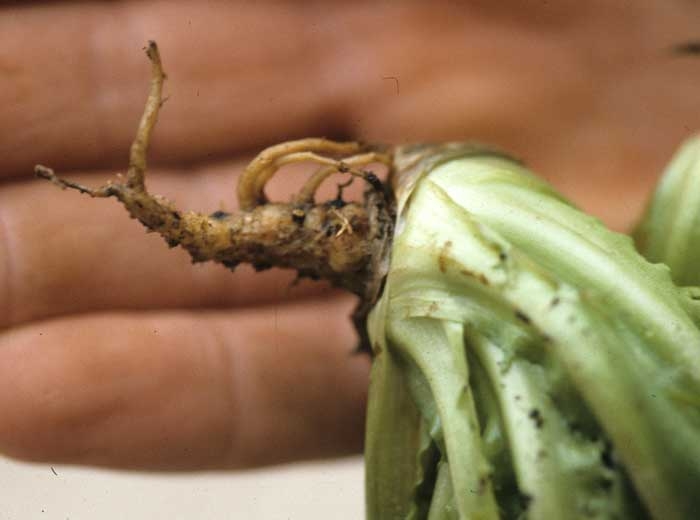 Thanatephorus cucumeris , like Pythium spp., Causes seedling mortalities linked to a constriction of the stem located at ground level, more or less brown and of rather dry consistency (figure 1).