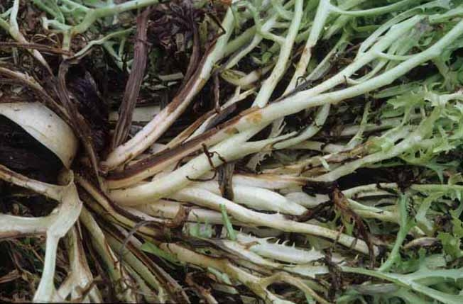 Figures 9 and 10 show damage caused by Thanatephorus cucumeris on chicory.