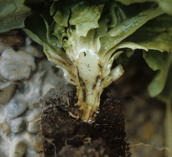 Salads affected by Pythium tracheiphilum show reduced growth (Figure 1); during very early attacks, plants can be completely blocked and remain dwarf. Their small size contrasts with that of the apparently healthy surrounding plants. The leaves of some salads may turn yellow and wilt. Initially, these wilts occur at the hottest times of the day and the plants recover at night. Subsequently, they sometimes take an irreversible character leading to the drying out and death of some plants.