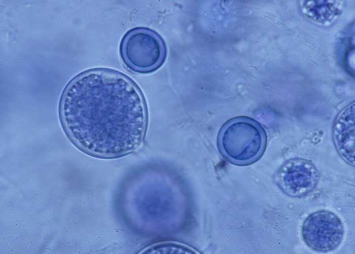 Although the biology of Pythium tracheiphilum is not well understood, it may be thought that it is likely to live in a state saprophytic at the expense of organic matter. It seems capable of attacking or being hosted by a number of different hosts of lettuce, which also ensure its multiplication and conservation: various Lactuca , sunflower, artichoke, cardoon, salsify, fennel , peas and some weeds, including groundsel. Artificial inoculations, carried out on cucumber, cauliflower, tomato and peas, demonstrated that this pseudo-fungus could attack these hosts. The strains encountered in the field would not have the same pathogenic power with respect to these hosts. It can be maintained in the soil thanks to resistance structures , such as its oospores (figure 1) and to a lesser degree its sporangia (figure 2).