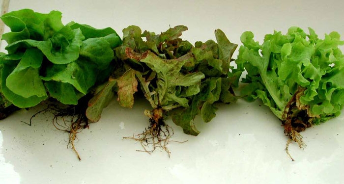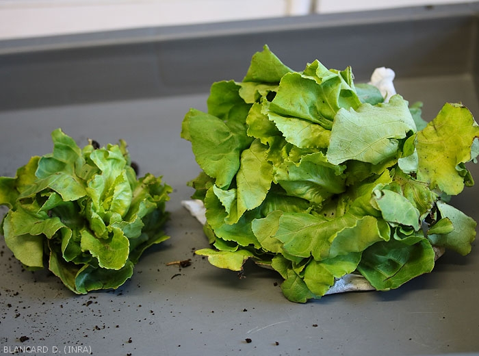 Affected adult plants show root and vascular symptoms comparable to those seen on seedlings. A longitudinal section reveals vessels of brown color (Figures 2 to 4). As a result, leaves on one side of the lettuce turn yellow and necrotize around the edge of the leaf blade.