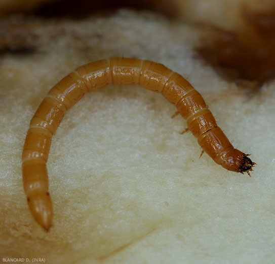 Larvae 3 to 3.5 cm long, white in color. The head and legs are brown and shiny (Figure 1). |