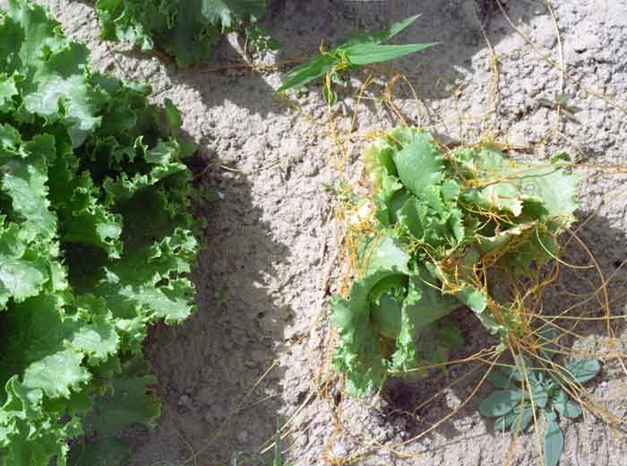 Cuscuta spp. is a parasitic plant of which many species have been reported around the world on the most diverse hosts. Salads are sometimes parasitized by it which gradually colonizes them thanks to twining stems. Salads affected in this way show reduced growth (Figure 1).