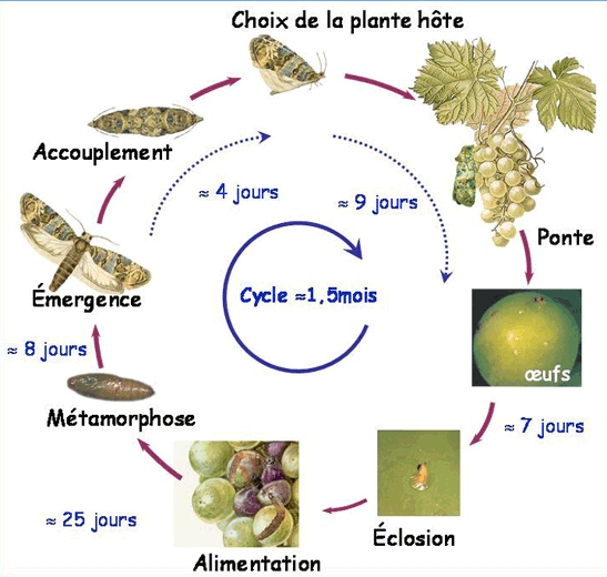 L'oeuf incube durant une dizaine de jours avant de voir l'éclosion de la larve néonate (jeune chenille). La chenille présente un stade errant, dit « stade baladeur » de moins de 24 h après lequel elle perfore un bouton floral puis les voisins qu'elle agglomère en tissant un fil soyeux pour former le « glomérule ». Cette sorte de nid grossira au fur et à mesure du grossissement de la chenille qui passera par cinq stades larvaires successifs protégée à l'intérieur du glomérule. Le terme de son développement correspond en général à la floraison où les glomérules sont facilement reconnaissables. La chenille quitte alors le glomérule et l'inflorescence pour trouver son lieu de nymphose (anfractuosités du cep, sol, bord des feuilles). La larve nymphose après avoir tissé un cocon blanchâtre de protection extérieure. La nymphose dure une semaine à une dizaine de jours.