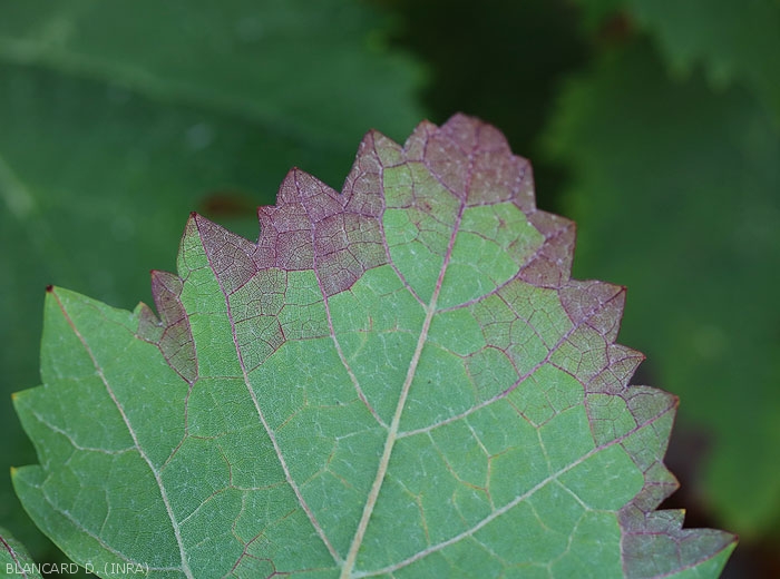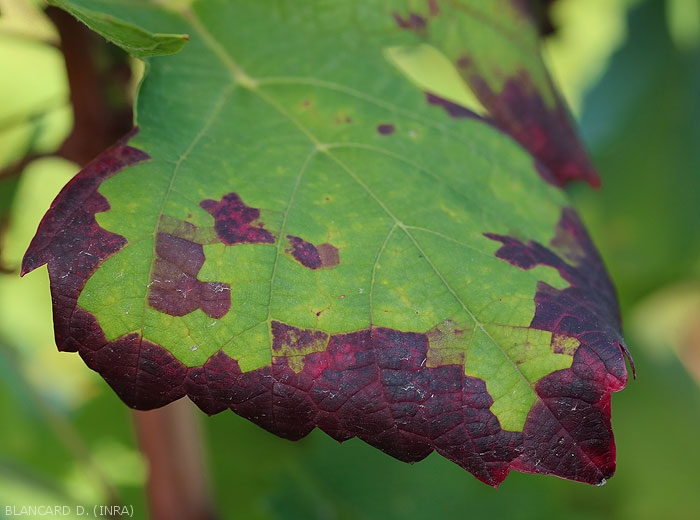 The discoloration begins at the periphery of the blade, it is blocky in shape and is delimited by the veins. The blade tends to curl slightly. Subsequently the leaves become necrotic and dry out.
