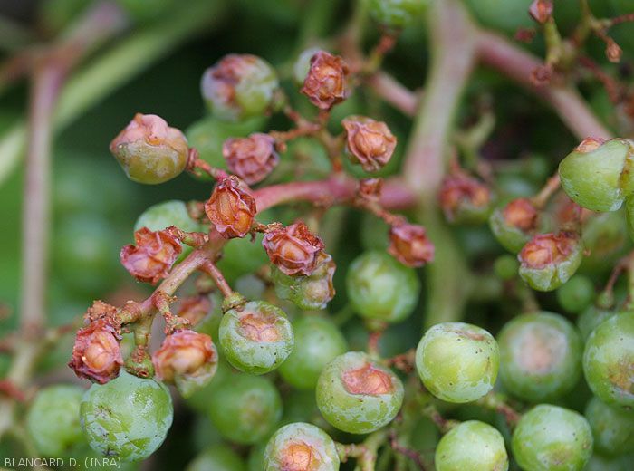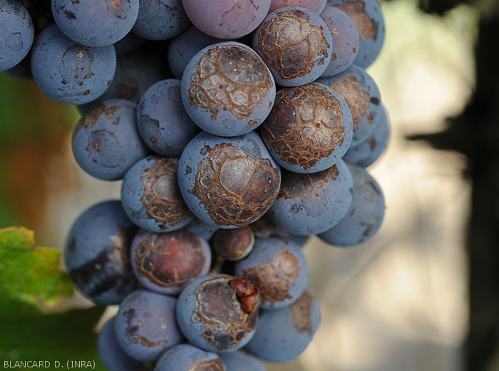 Sunburns are quite common in plants, as in vines. They appear on the herbaceous parts at temperatures above 42 ° C, and in particular the usually shaded organs. We can thus observe partial desiccations of the leaves , the blade of which turns brown and necroses over more or less extensive areas. On berries , it is essentially the side most exposed to the sun that is affected. Thus, a reddish brown lesion appears on one side of the fruit, subsequently the entire berry can dry out. If the stress is high, the cluster whole is affected.