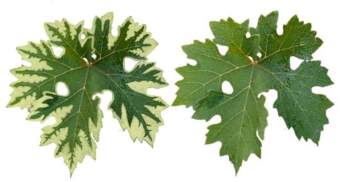 Leaves : diffuse discoloration of the blade which turns white-yellow on white varieties, and reddish on black varieties. The blade necroses in spots between the veins and on the periphery. It is also blistered, thicker and leathery in young leaves. Twigs : weak growth with shorter merithalles. Presence of numerous zig zag ramifications. Appearance of protuberance on diseased twigs that don't taste well, especially at their upper extremity. Inflorescences : withering and millerandage. Berries : soft in consistency and dirty green in color; their film has a wrinkled appearance. |