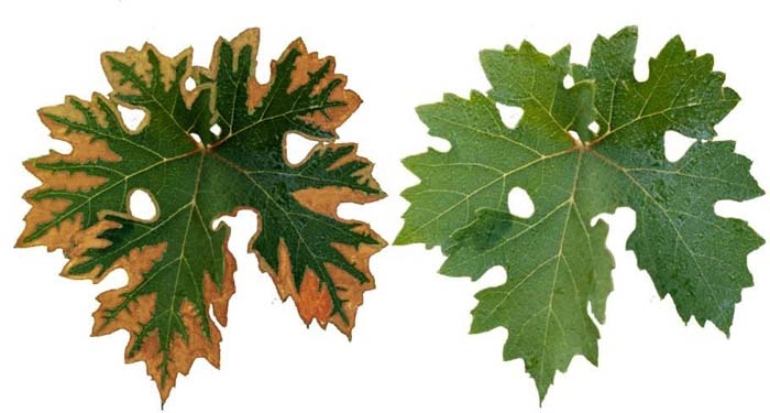 Reduction in the vigor and vitality of the strains. Leaves : discoloration of the blade varying from yellow to red-orange depending on the grape variety (figure 5). Falling leaves. Roots : early maturity, quite premature. Berries : reduction in ripening and quantity. |