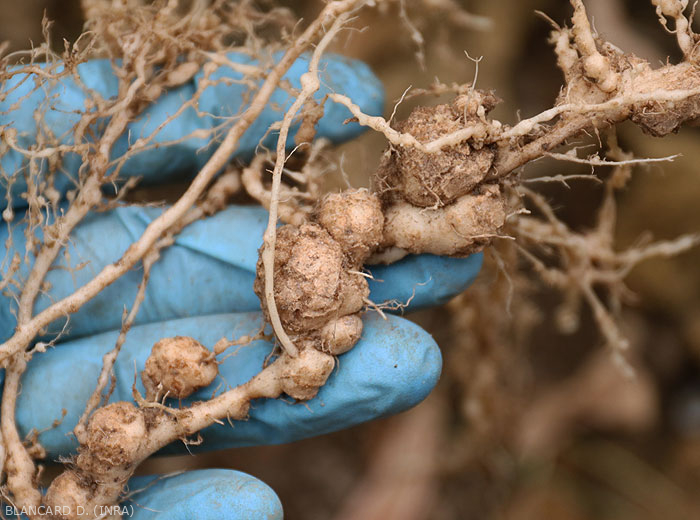 Parasitism : The larvae penetrate the roots and migrate to the vessels through the cortex, between the cells. Induce galls surrounding large pear-shaped females which produce numerous eggs (300 to 3000, between 400 and 500 on average).