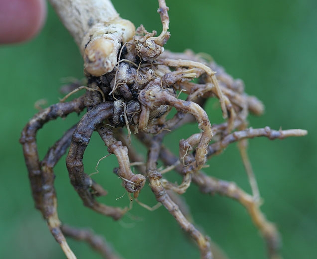 In fact, the leaf wilting observed is the result of primary symptoms located on the roots (figure 3). On the latter, we can observe generally brown lesions, of limited size at first (Figure 4). Subsequently, root degradation is accentuated and generalized. Thus, most of the damaged secondary and tertiary roots break off and decompose. They are therefore generally not visible when diseased plants are pulled up. It should be noted that secondary microorganisms can invade root tissues, in particular those of the cortex, and thus contribute to their destruction (figure 5).