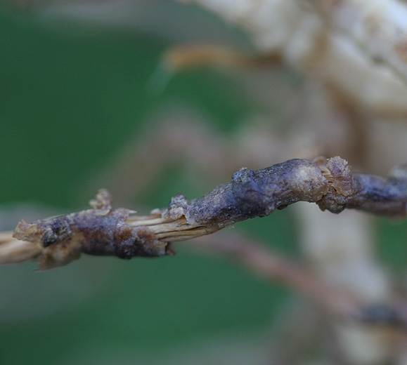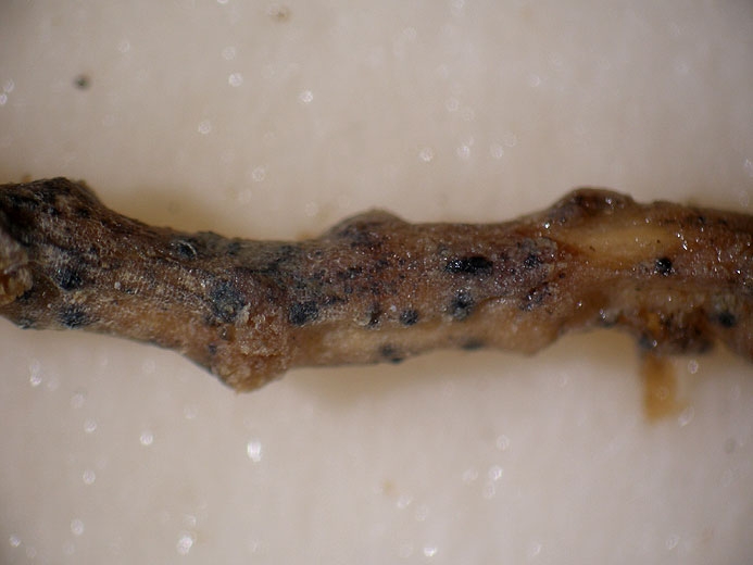 Tiny black spherical structures , perithecia M. cannoballus and ascospores, are visible on the surface of the roots (Figures 6 and 7) and characterize the presence of this fungus. These signs, materializing the sexual or teleomorphic form of this ascomycete, are not always easy to observe because they can form on already well decomposed root tissues which will not be recovered during the uprooting of the root systems. Also, take care to gently pull them out with the help of a tillage tool.
