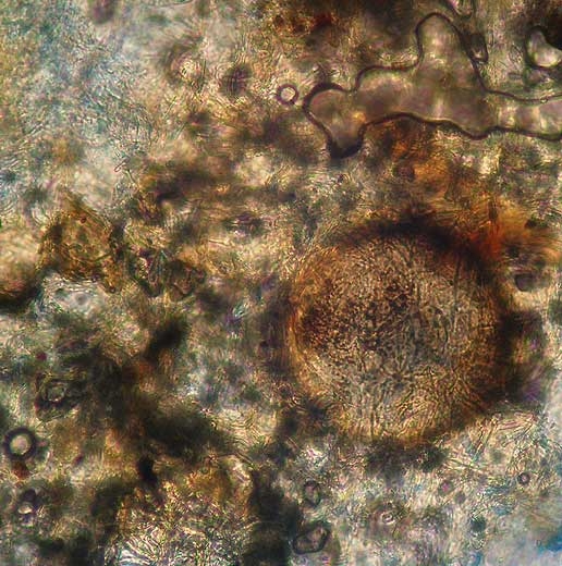 M. cannonballus forms spherical and black perithecia (measuring between 40 and 50 µm in diameter) in root tissues (Figures 1 to 4 and 7), this late in the season after harvest or plant death. At maturity, these structures contain numerous asci each containing a spherical ascospore (Figures 4 to 6, 8 and 9). Several hundred thousand ascospores could be produced and released from a root system of a diseased melon plant. These ascospores are distributed vertically and horizontally in cultivated soils in a uniform manner. Their number is still higher in the superficial soil stratum.