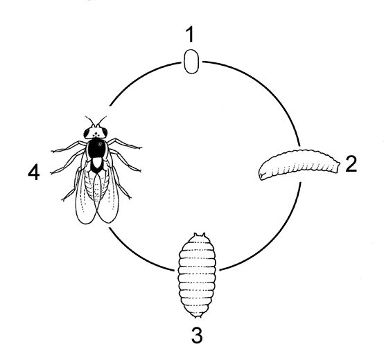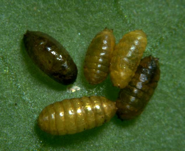 Leafminers have 6 stages of development during their cycle (Figure 3): egg, 3 larval stages, pupa and adult.