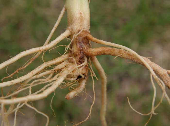 Affected plants are often poorly developed and chlorotic. They sometimes wilt on hot days.