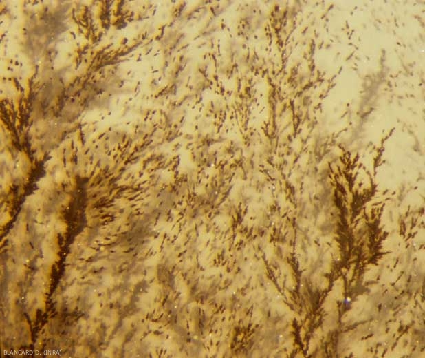 V. dahliae produces in the tissues microsclerotia (figures 1 and 2) at temperatures between 10 and 20 ° C) and fragile conidiophores whorled forming ovoid conidia (figures 3 to 5). The brown to black, thick-walled, variable-shaped microsclerotia (measuring 15-100 µm) are found in the wastes of infected crops and are eventually released into the soil. Dissemination is possible by soil, by agricultural equipment soiled by contaminated soil, by plant debris or directly from one plant to another by root contact. Soil dust containing soil microsclerotia (figures 1 and 2) and / or conidia (figure 5) is disseminated by air currents, as well as by splashing water and insects.