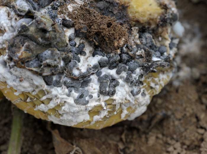 When the ambient humidity allows it, it forms white mycelium more or less dense and sclerotia on the damaged tissues. When crop residues are incorporated into the soil, 70% of the sclerotia are found in the first 8 centimeters of depth.