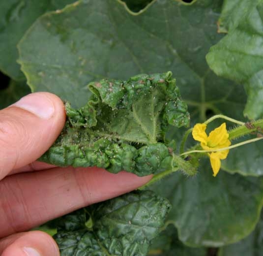 Several species of aphids * ( aphids ) can form colonies on the young leaflets of Cucurbitaceae and melon (figures 1 to 3), this from the nursery: Myzus persicae (Sulzer 1776) (figure 9), Aphis gossypii ( Glover 1877) (figure 10), Macrosiphum euphorbiae (Thomas 1878) (figure 11), Aulacorthum solani (Kaltenbach 1843) (figure 12) ... These polyphagous insects belong to the order Hemiptera, to the suborder Sternorrhyncha and to the superfamily Aphidoids. They develop quite frequently on melon in the form of colonies. they are especially formidable by their capacity to transmit several Viroses . In addition, the chemical control of populations of these pests is often problematic because of their possible resistance to several insecticides.