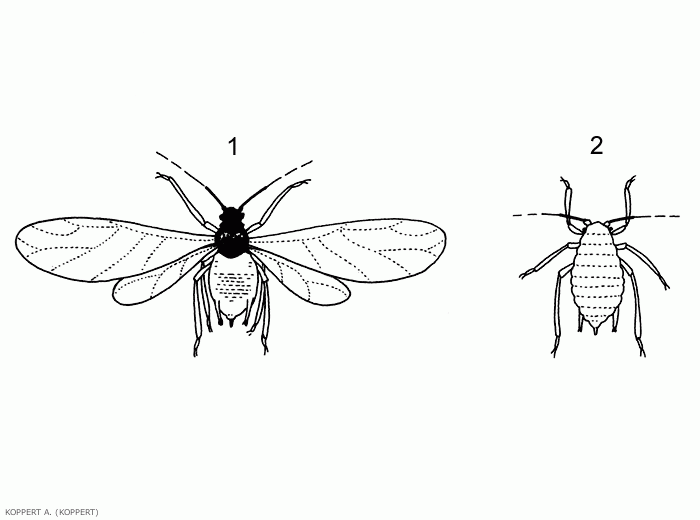 Young larvae form, which immediately feed on the sap and molt 4 times before giving birth to the adult. White moults (exuviae) on vegetation indicate the presence of aphids in the crop. The adults are winged (1) or not; in the latter case, we speak of “wingless” individuals (2) (figure 13). Each individual can give birth to 40-100 offspring depending on the host and climatic conditions in particular.