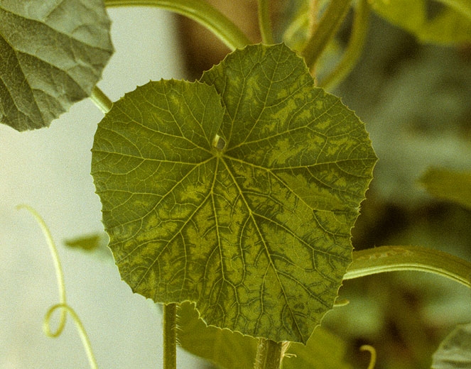 In melons, the squash mosaic virus ( SqMV ) induces a mosaic leaf more or less strong often accompanied by interveinal discoloration, which gives the blade a characteristic appearance called by the Anglo-Saxons " vein-banding "(Figures 1 to 3). Ring spots can also be observed. Sometimes the symptoms are much more accentuated and we can witness strong deformations of the leaves (figure 4) which then take on an "oak leaf" appearance (figure 5).