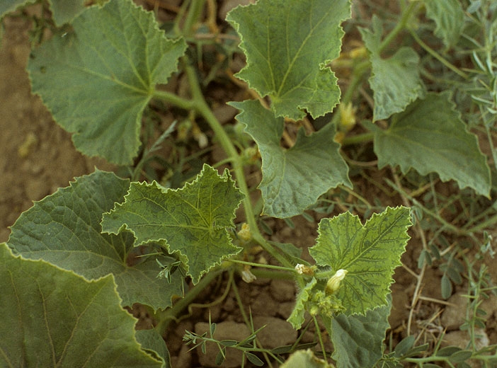 In watermelon : Most strains of SqMV do not infect watermelon. However, one strain has been reported in Arizona to cause severe mosaicism in this species.