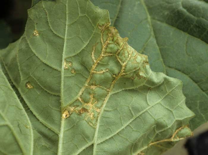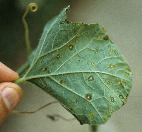 In cucumber: symptoms are expressed by necrotic spots 5 to 10 millimeters in diameter on the leaves. These spots can then merge and cause necrosis of the leaf or even of an entire branch. In co-infections with CGMMV, oily chlorotic spots may be observed on the fruits.