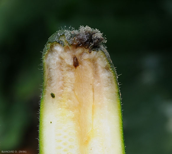 The fruits of Cucurbitaceae, like those of many other plant species, have natural entry points liable to be colonized by Botrytis cinerea , and in particular nutritive bases (senescent tissues such as flowers, or dried petals) or wounds. This is particularly the case at the level of the stylar scar where the faded petals remain attached (figure 4) for a longer or shorter period of time depending on the ambient humidity. The latter are ideal nutritional bases which allow this opportunistic fungus to settle and subsequently contaminate the fruits. Thus, a moist, dark rot develops at the tips of the fruits (Figures 5-8).