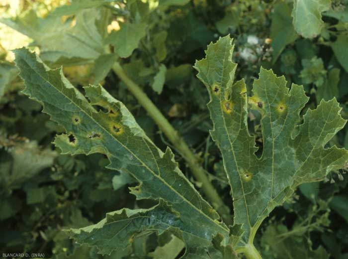 Small moist lesions appear on leaves often the youngest . These lesions gradually spread to form more or less circular spots, turning brown and necrotizing with age. They can sometimes take a grayish tint and be haloed with a more or less wide yellow halo. Affected tissue may loosen and fall, giving the inner part of the spots a more or less starry appearance, and the leaves a riddled appearance. Note that wet lesions sometimes start from veins that turn brown locally.