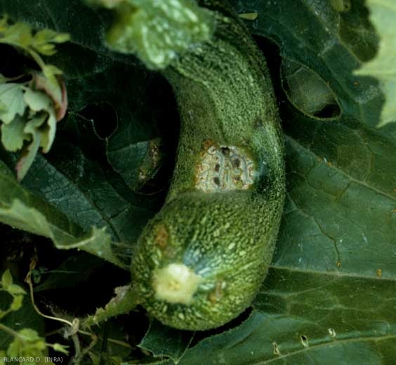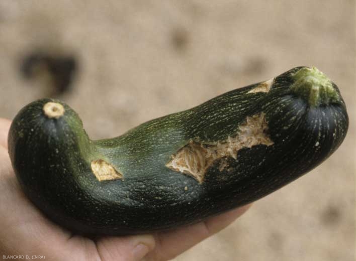 As for the fruits of zucchini and squash , they show small greasy, canker and brown spots when they are young (Figures 9 to 13). Once well developed, they are sometimes corky and strongly deformed (Figures 14 and 15).