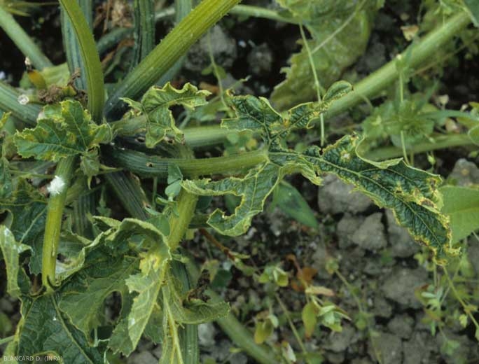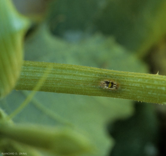 On zucchini , many greasy and necrotic spots can be observed on the petioles (Figures 6 to 8).