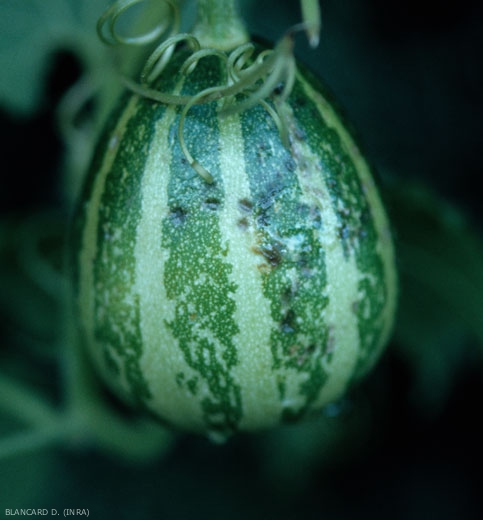 on fruits Cladosporiosis is most damaging . Small canker, greasy and concave spots, often going unnoticed, initially develop on young fruits which are particularly sensitive. They then spread, sometimes confluence, and take a circular to elongated shape and a rather light shade. Gradually browning gummy exudates locally bead. Note that these spots are initially harmless on the young fruits of Cucurbitaceae; as development progresses, they have very important repercussions on their shape in particular. Indeed, their extension and the local establishment of corky scar tissue in relief sometimes lead to bursts and significant deformations, making the fruits unmarketable.