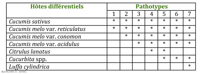 At least 7 pathotypes have been reported from a differential host range consisting of several Cucurbits (Figure 1). Depending on the country, the range of species showing symptoms of late blight varies according to the strains prevalent, and their virulence. Note that pathotype 5, capable of attacking species of the genera Cucumis , Cucurbita and Citrulus , was already described in one of our neighbors: Italy in 2002.