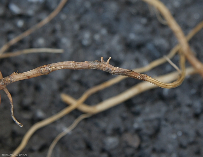 After having pulled up and carefully washed the root systems of a few diseased plants, we see that they are more or less altered (figures 1 to 4), rotten, locally suberized. Some roots have disappeared and those which remain show more or less extensive reddish-brown necrotic lesions (figures 5 and 6), some are more or less corky (figures 3, 4 and 7). The root tissues end up rotting and decomposing, which ultimately means that the root systems are very reduced.