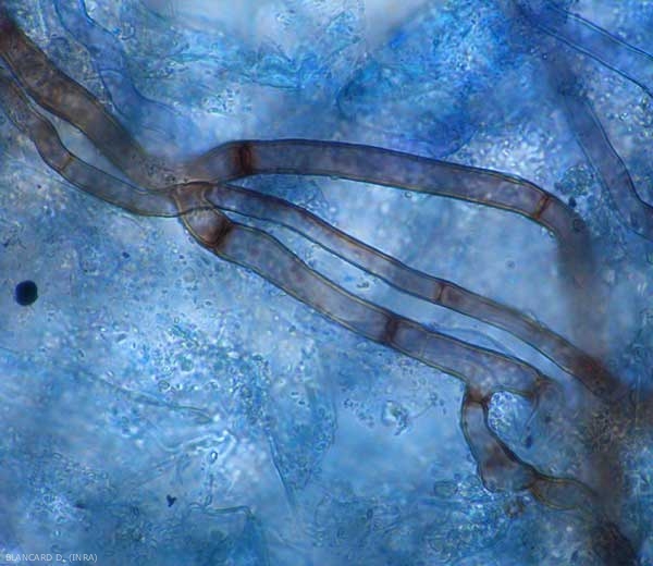 Thanatephorus cucumeris (Rhizoctonia solani) is frequently found in many soils which have repeatedly grown vegetable crops. It has in fact saprophytic potentialities allowing it to be preserved in the soil in the absence of sensitive hosts. It is found in the state of mycelium (figures 1 and 2) and pseudo-sclerotia (figure 3), often in organic matter and the most diverse plant debris that it easily colonizes. It grows easily in the soil, especially if the soil has been disinfected and cleared of potential antagonistic microorganisms. This parasitic fungus, very polyphagous , can attack and persist on the most diverse hosts and on their debris. It can be present in certain substrates and composts, sometimes in certain peats or on a few purchased plants. It is not uncommon for it to pollute non-disinfected material used in nurseries.