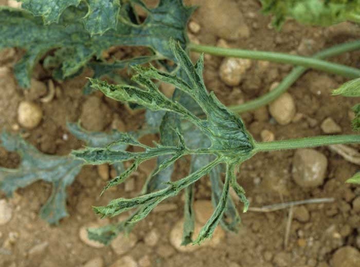 The first symptoms on foliage are thinning of the veins (figure 2) and yellowing (figure 3) which quickly develop into a mosaic (figures 4 and 11). The symptoms quickly become much more severe with significant deformities: dark green blisters and blisters (figure 5), "shoe lace" leaves (filiformism) (figures 6 and 7). These latter symptoms can now be confused with those produced by severe strains of WMV.