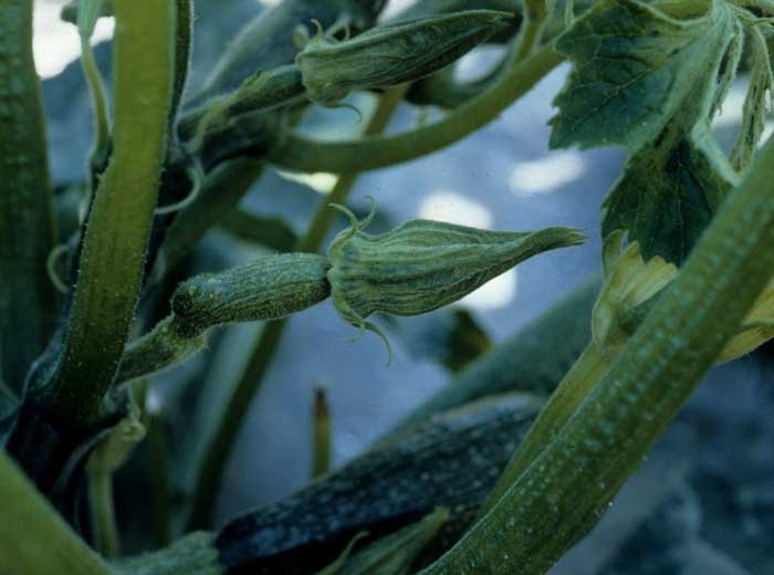 The symptoms on fruits are also very spectacular: discoloration particularly marked on varieties with yellow fruits, and above all significant blisters which completely deform courgettes (figures 8 to 10) and squash (figures 12 and 13). The fruits are of course not salable, and crop loss can be complete with early infection.
