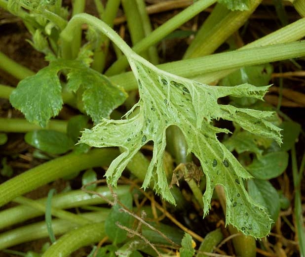 ZYMV is transmitted non-persistent by more than 11 species aphid , including the melon aphid, Aphis gossypii , and the green peach , aphid Myzus persicae . The aphid vector is capable of acquiring the virus on an infected plant, or of transmitting it to a healthy plant, during very brief bites of the order of a few tens of seconds which are the "test" bites allowing the insect to recognize whether the plant on which it has landed is a favorable host for its development. The aphid remains able to transmit the disease generally for a few tens of minutes or even a few hours, but it quickly loses this ability if it performs test bites or feeding bites. However, he may acquire the virus again if he repeats test bites on an infected plant. The very high efficiency of this mode of transmission means that the disease can spread in a crop without significant outbreaks of aphids having been observed.