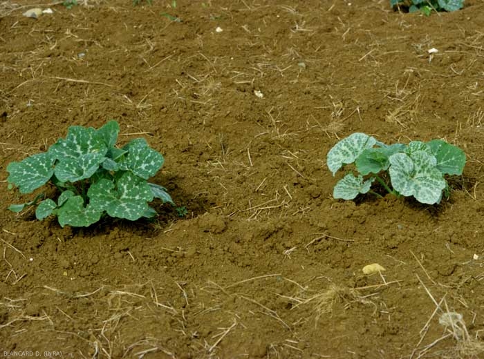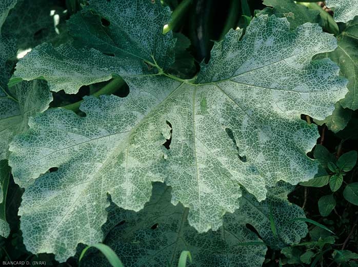 The 3 main species Cucurbita cultivated can show silvering symptoms: C. pepo , C. maxima and C. moschata , but also wild species like C. ecuadorensis and C. martinezii . Nevertheless, differences in sensitivity to the silvering have been observed in species Cucurbita . Cucumber, melon and watermelon are not affected.